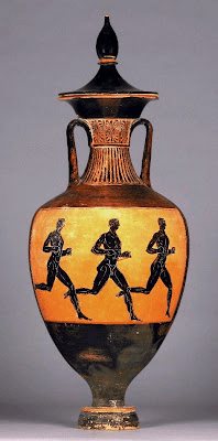 - Carreras de velocidad: Se situaban de pie sobre la línea de salida, con el cuerpo y los brazos hacia delante y la pierna derecha algo más retrasada. El juez decía “poned el pie en la línea de salida, pie junto a pie y salid” y sonaban las trompetas.
