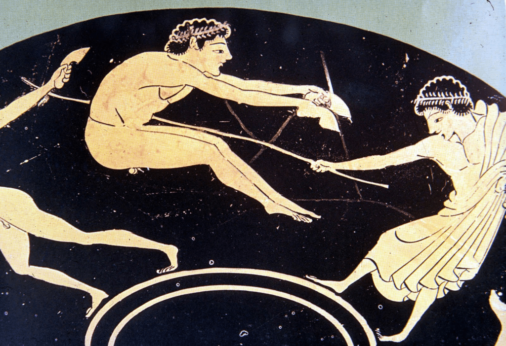 - El pentatlón: lanzamiento de disco y jabalina, salto de longitud, carrera de un estadio, lucha.