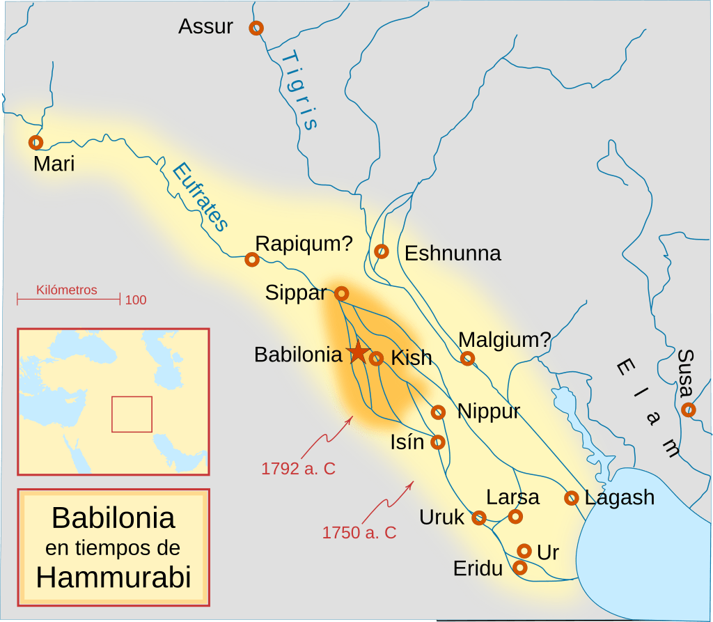 El rey Hammurabi estableció una compilación de leyes conocida como el Código de Hammurabi. Este es el primer Código de Leyes escritas en la Historia. Se recogió en tabletas de arcilla y en una estela de piedra.
