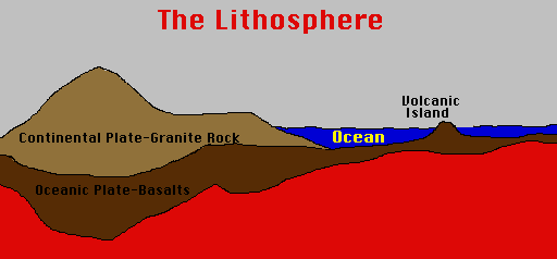 Basaltic rocks of the ocean plates are much denser and heavier than the granitic rock of the continental plates. Because of this the continents ride on the denser oceanic plates. The crust and the upper layer of the mantle together make up a zone of rigid, brittle rock called the Lithosphere. The layer below the rigid lithosphere is a zone of asphalt-like consistancy called the Asthenosphere. The asthenosphere is the part of the mantle that flows and moves the plates of the Earth.